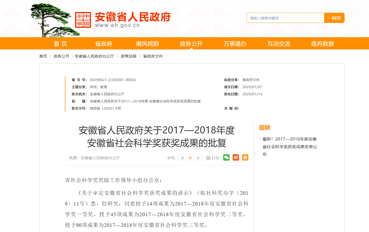 安徽省人民政府关于2017—2018年度安徽省社会科学奖获奖成果的批复