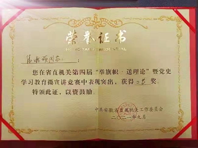 9月23日,安徽省直机关第四届“举旗帜·送理论”暨党史学习教育微宣讲竞赛决赛在合肥举行。我会普教咨询(科研)处张淞硕同志经过预赛选拔、视频评选、集中培训等环节激烈角逐,以出色表现荣获二等奖;机关党委获得优秀组织奖。